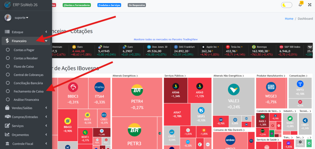 Para acessar o Fechamento de Caixa, na aba lateral, clique em “Financeiro” -> “Fechamento de Caixa“.