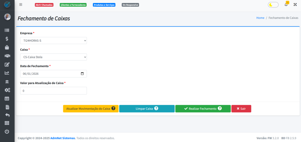 - Atualizar Movimentação do Caixa: Realiza um ajuste de saldo final baseado no valor informado a partir da data digitada;
