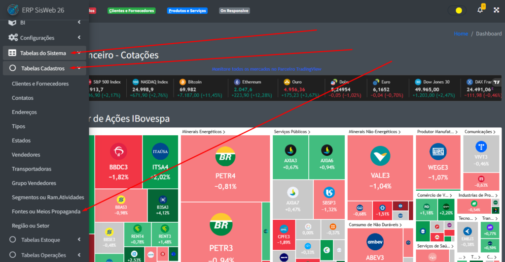 Para poder acessar a parte de propaganda, na aba lateral do site, clique em “Tabelas de Sistema” -> “Tabelas Cadastros” -> “Fontes ou Meio Propaganda“.