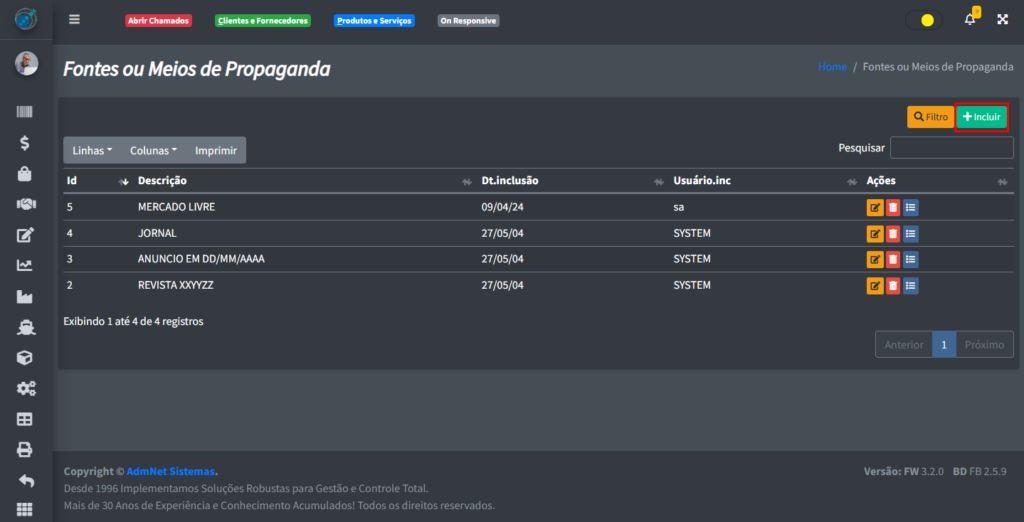 Para pode incluir um novo meio de propaganda, clique no botão “+ Incluir“: