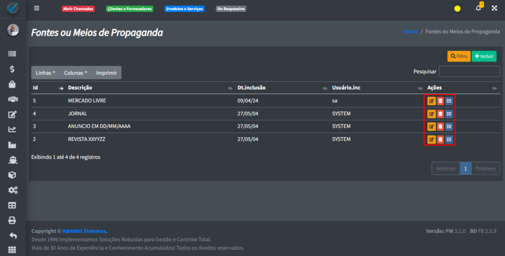 Como você deve ter percebido, há alguns botões na parte direita de cada registro da tabela: