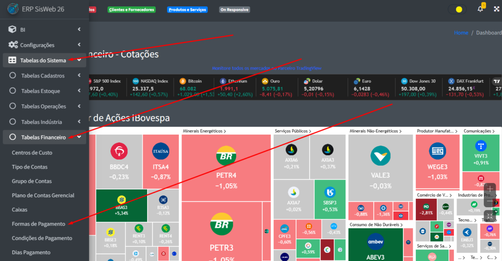 Para poder acessar a parte de forma de pagamento, na aba lateral do site, lique em “Tabelas de Sistema” -> “Tabelas Financeiro” -> “Formas de Pagamento“.