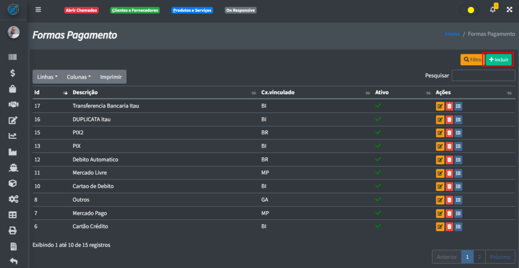 Para pode incluir uma nova forma de pagamento, clique no botão “+ Incluir“:
