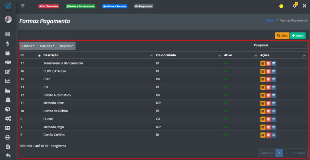 Ao clicar no botão de “Salvar“, você vai voltar para a tela anterior de maneira automática e poderá ver a sua nova forma de pagamento na tabela.