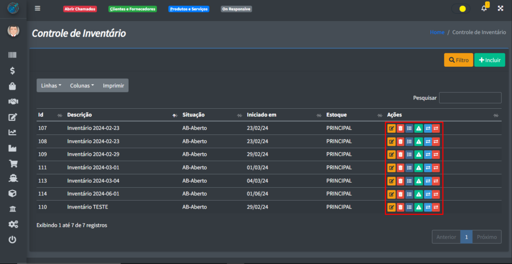 Após adicionar um novo inventário ao sistema, você vai perceber que o cadas registro possuí alguns botões do lado direito dele:
