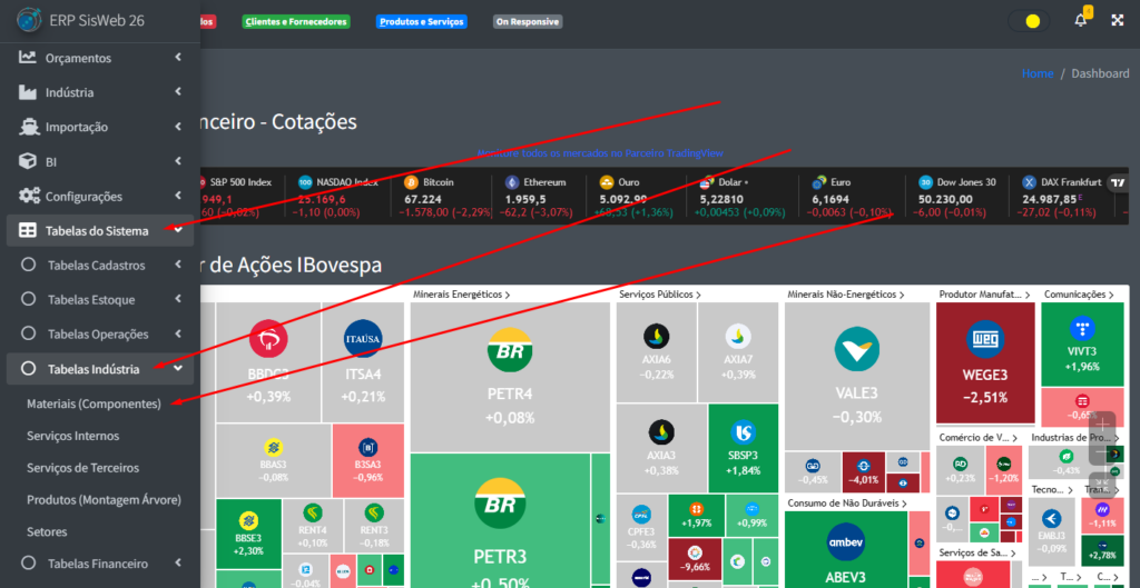 Para poder acessar a parte de material/componente, na aba lateral do site, clique em “Tabelas de Sistema” -> “Tabelas Industrial” -> “Materiais (Componentes)“.