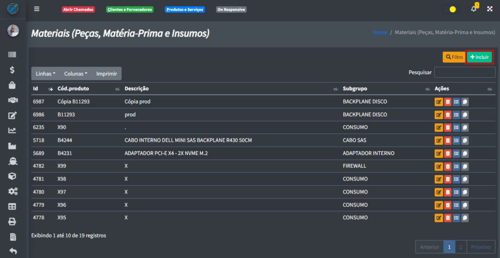Para pode incluir um novo material/componente, clique no botão “+ Incluir“: