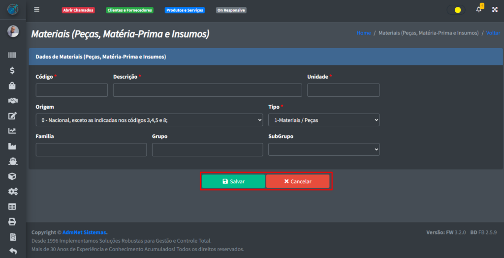 Após clicar em “+ Incluir“, você verá uma tela onde poderá cadastrar o seu novo material/componente: