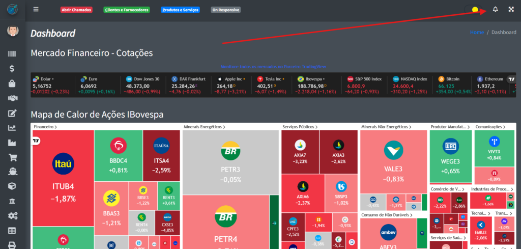 Para acessar as notificações do sistema, clique no “Sino” no canto superior direito do sistema