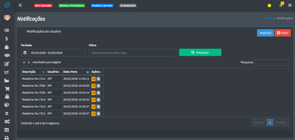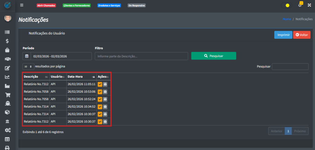 Há alguns botões ao lado dos registros. O botão de “Ativar/Desativar“, habilita ou desabilita a notificação para aquele relatório. Já o botão “Imprimir relatório“, ele abre uma tela para que você posse imprimir o relatório selecionado.