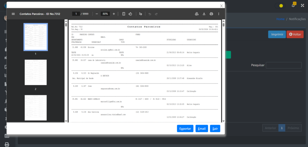 - Email: Abre uma tela onde você pode passar informações de para quem você gostaria de enviar o relatório por email;