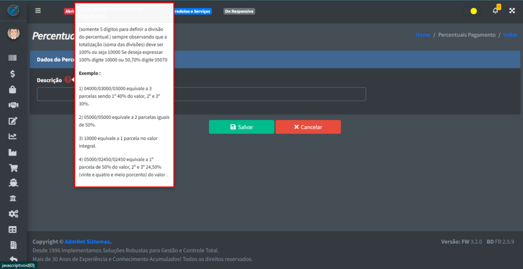 Após clicar em “+ Incluir“, você verá uma tela onde poderá cadastrar o seu percentual de pagamento: