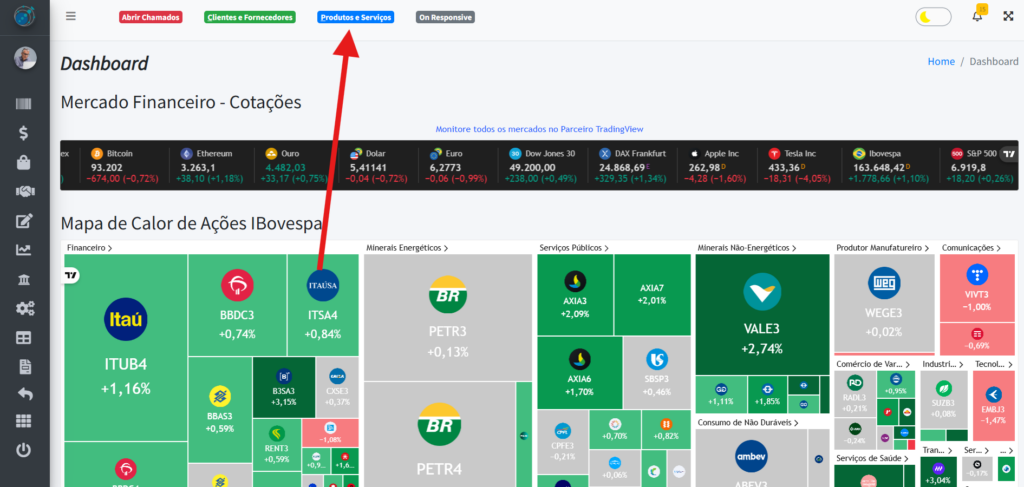 Para acessar o filtro, clique no botão “Produtos e Serviços” na parte superior do sistema.