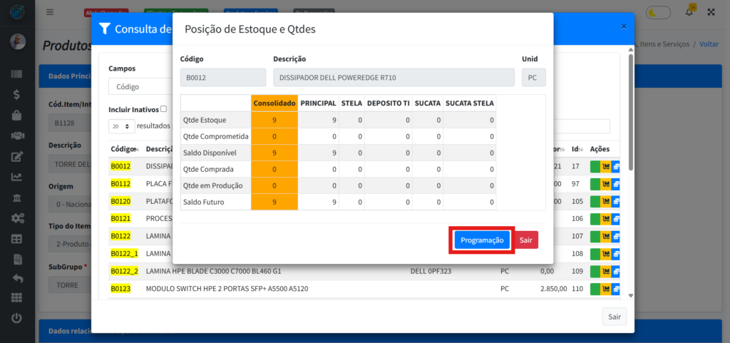 O botão “Programação” mostra a movimentação prevista do item selecionado.