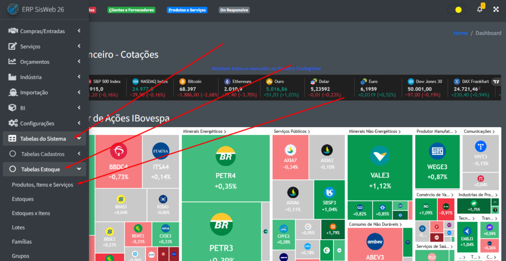 Para poder acessar a parte de produtos/itens/serviços, na aba lateral do site, clique em “Tabelas de Sistema” -> “Tabelas Estoque” -> “Produtos, Itens e Serviços“.