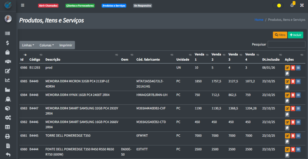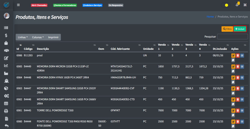 Para pode incluir um novo produto/item/serviço, clique no botão “+ Incluir“: