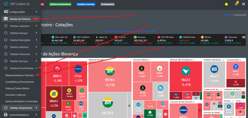 Para poder acessar a parte de centro de custo, na aba lateral do site, clique em “Tabelas de Sistema” -> “Tabelas Portal Vendas” -> “Representantes e Clientes“.
