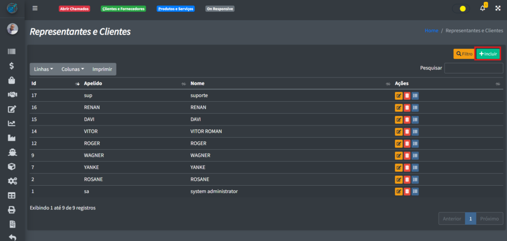 Para pode incluir um novo representante e cliente, clique no botão “+ Incluir“: