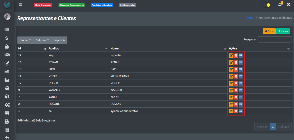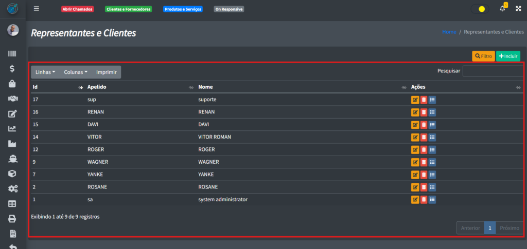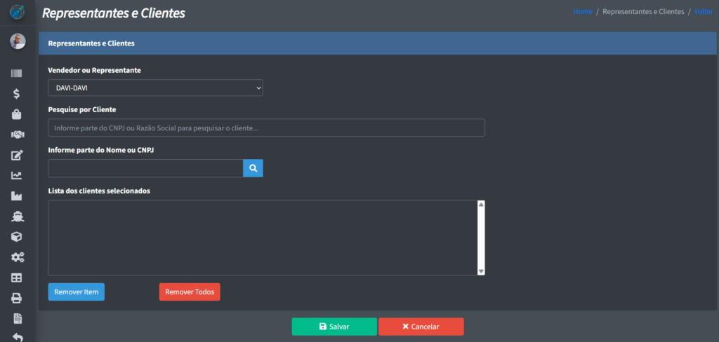 Ao clicar no botão de “Salvar“, você vai voltar para a tela anterior de maneira automática e poderá ver o seu novo representante e cliente na tabela.