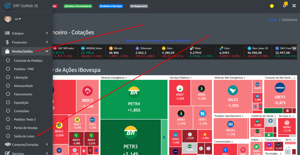 Para ter acesso aos a saída de lotes ,na aba lateral do sistema, vá para “Vendas/Saídas” -> “Saída de Lotes“.