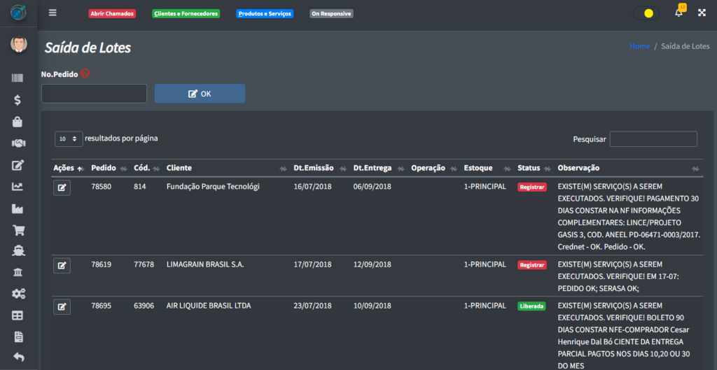 Na tela de Saída de Lotes, serão listados todos os pedidos de vendas disponíveis.