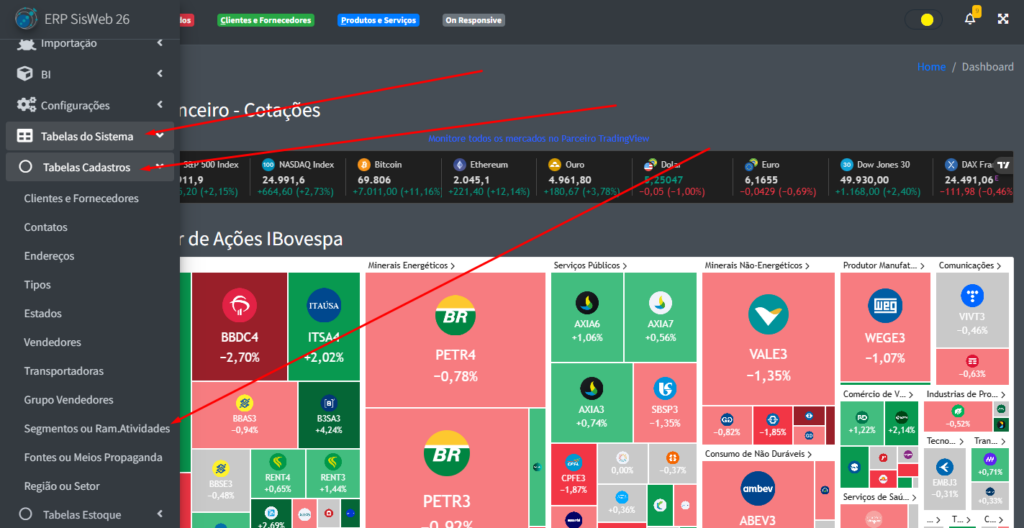Para poder acessar a parte de cadastro de contatos, na aba lateral do site, clique em “Tabelas de Sistema” -> “Tabelas Cadastros” -> “Segmentos ou Ram.Atividades“.