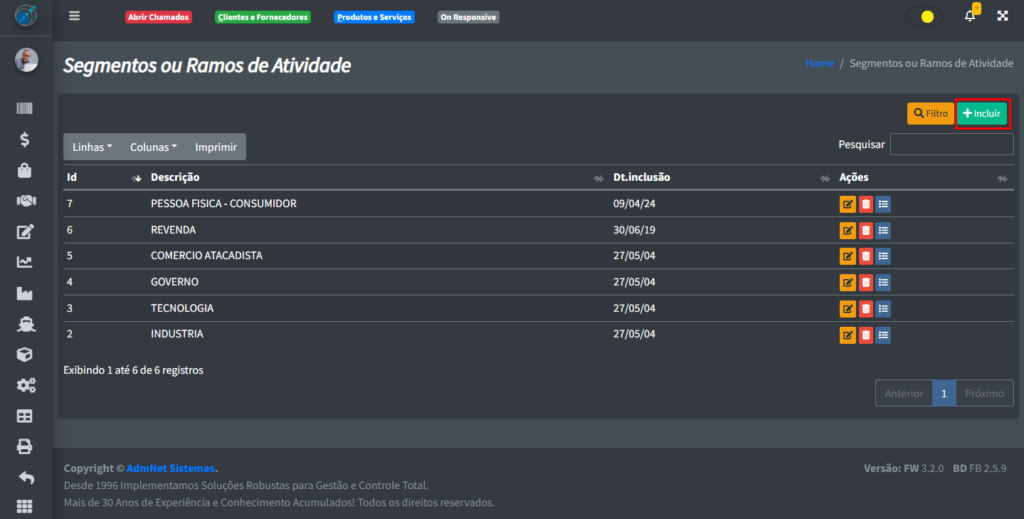 Para pode incluir um novo segmento ou ramo de atividade, clique no botão “+ Incluir“: