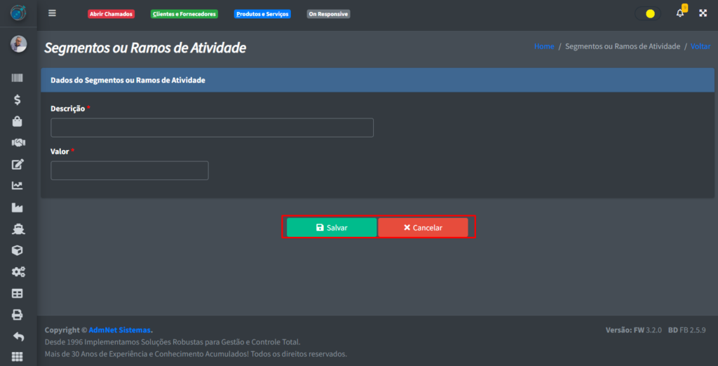 Após clicar em “+ Incluir“, você verá uma tela onde poderá cadastrar o seu segmento:
