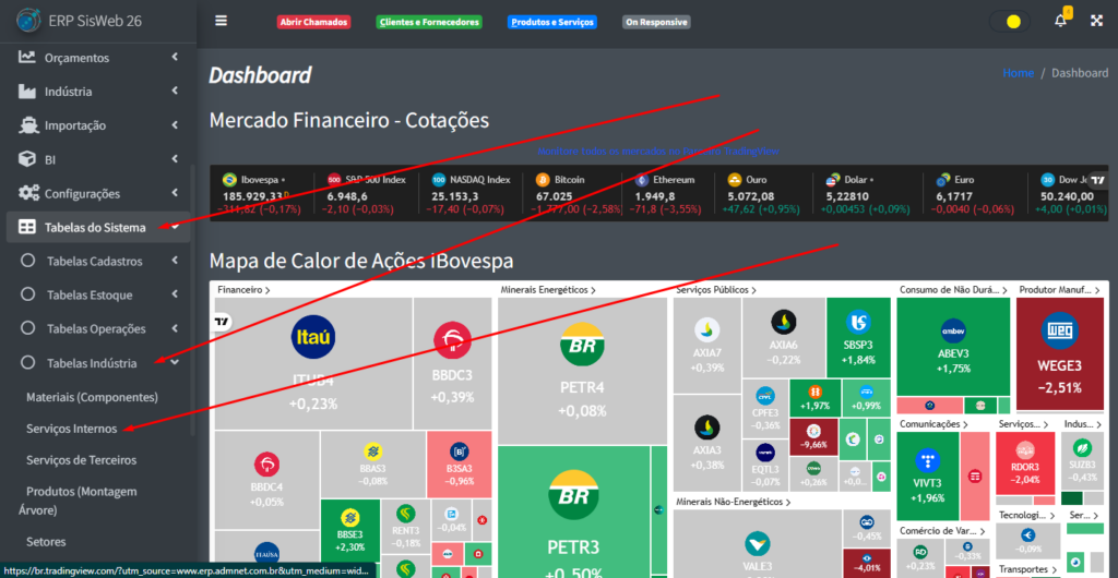 Para poder acessar a parte de serviços internos, na aba lateral do site, clique em “Tabelas de Sistema” -> “Tabelas Industrial” -> “Serviços Internos“.