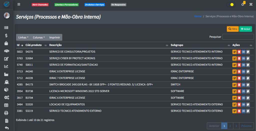 Para pode incluir um novo serviço interno, clique no botão “+ Incluir“: