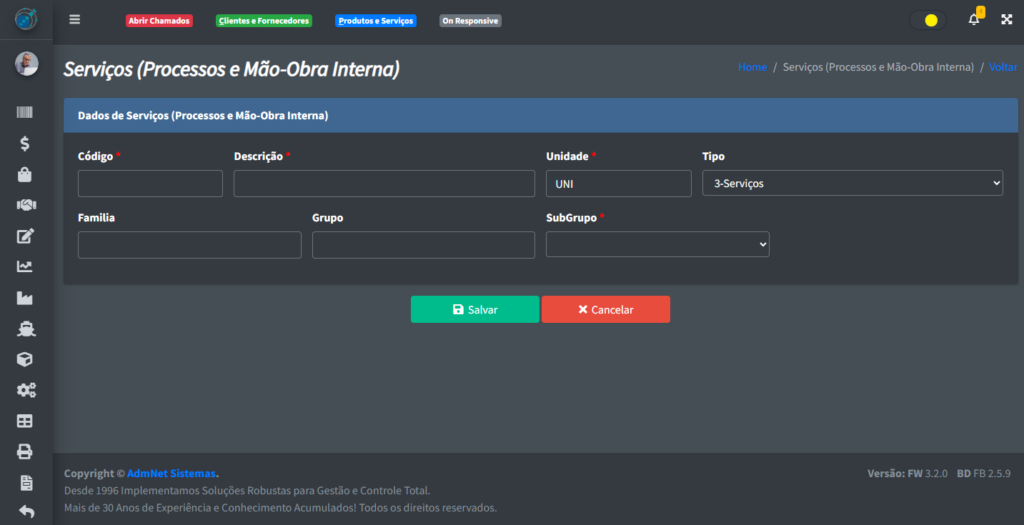 Após clicar em “+ Incluir“, você verá uma tela onde poderá cadastrar o seu novo serviço interno:
