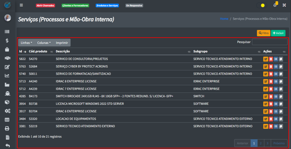 Ao clicar no botão de “Salvar“, você vai voltar para a tela anterior de maneira automática e poderá ver a seu novo serviço interno registrado na tabela.