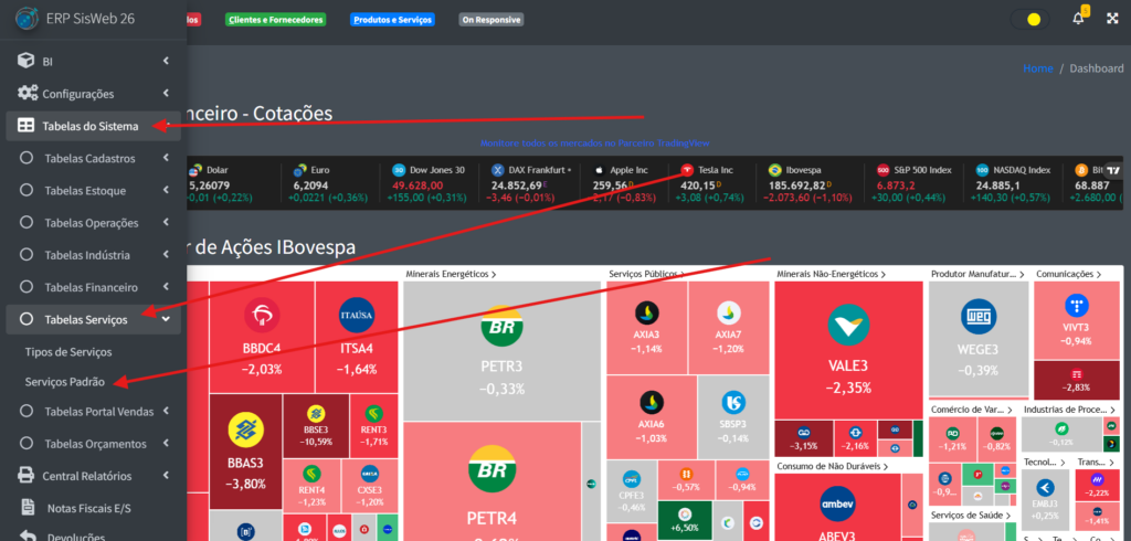 Para poder acessar a parte de serviço padrão, na aba lateral do site, clique em “Tabelas de Sistema” -> “Tabelas Serviços” -> “Serviços Padrão“.