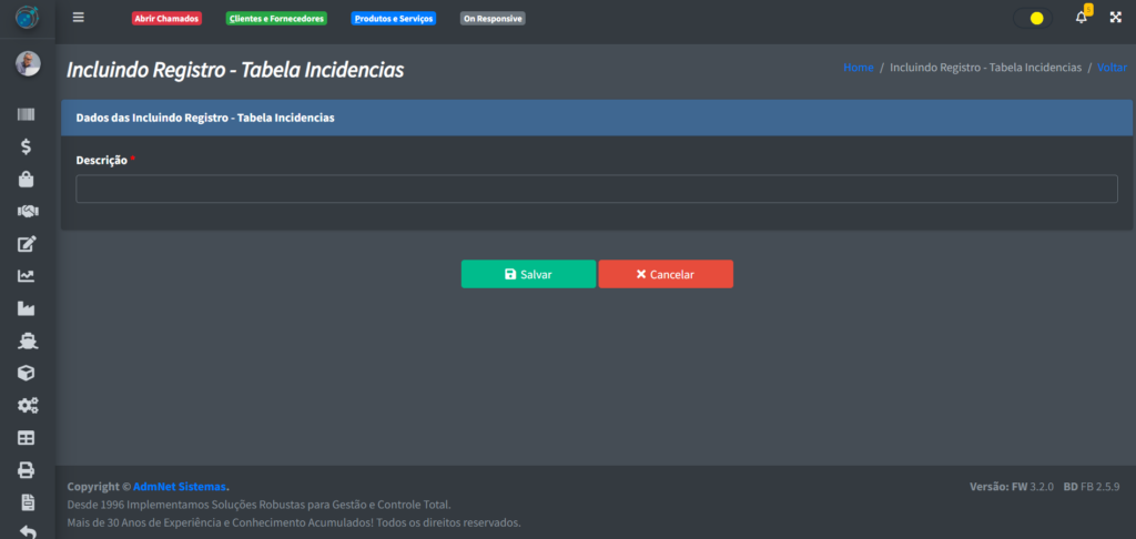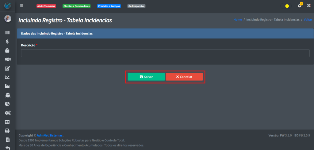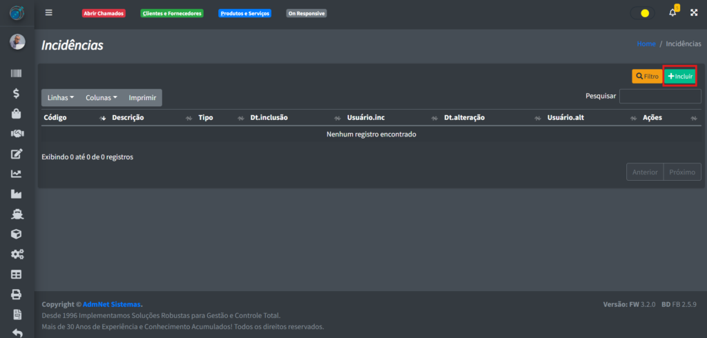 Após clicar em “+ Incluir“, você verá uma tela onde poderá cadastrar a sua nova incidência: