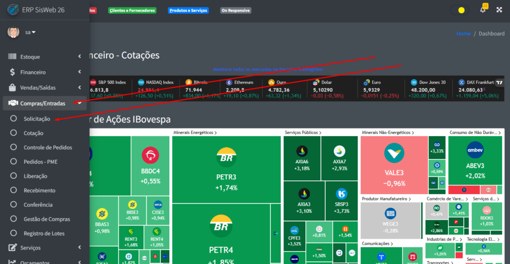Para poder verificar a solicitação de pedidos das compras, vá na aba lateral do sistema e clique em “Compras/Entradas” -> “Solicitação”.