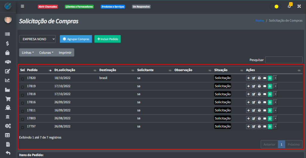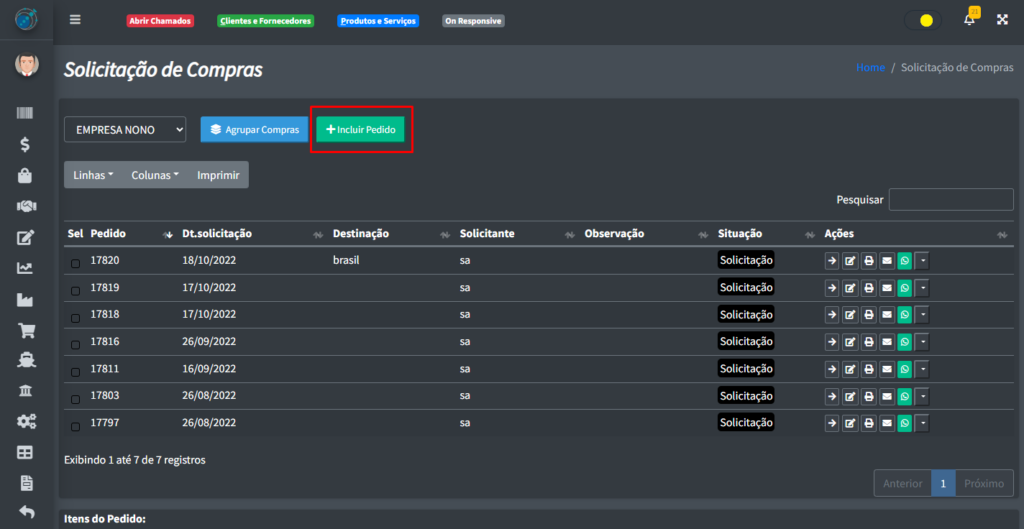 Caso não haja nenhum registro na tabela como na imagem acima, não se preocupe, iremos aprender a como incluir um novo pedido pela solicitação de compra.