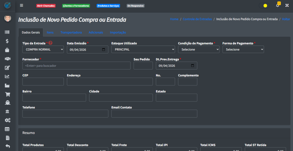 Após clicar no botão “+ Incluir Pedido“, você verá a seguinte tela: