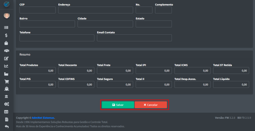Após informar todos os campos necessários, você verá dois botões no fim da tela: “Salvar” e “Cancelar“. O botão de “Salvar” guarda o seu novo pedido para que ele seja armazenado no banco de dados e o botão “Cancelar” cancela a inclusão do seu novo registro.