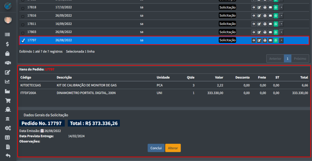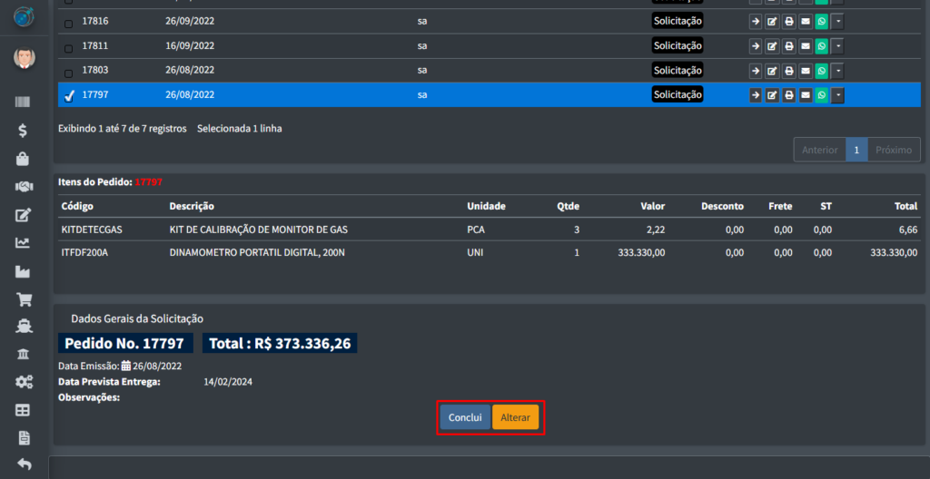 Ao clicar no botão “Conclui“, você mudará a situação do registro, levando ele para Cotação. E, ao clicar no botão “Alterar“, você altera uma ou mais informações do registro.
