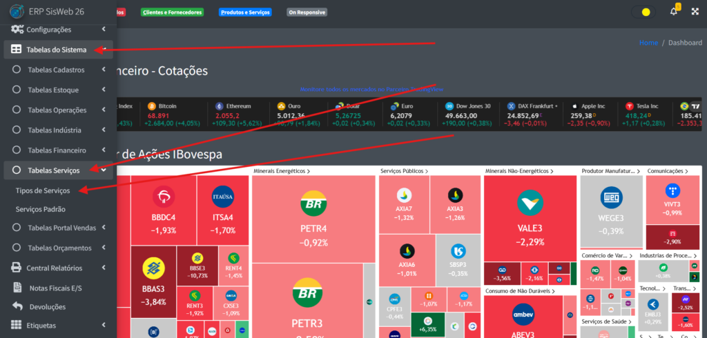 Para poder acessar a parte de tipo de serviço, na aba lateral do site, clique em “Tabelas de Sistema” -> “Tabelas Serviços” -> “Tipos de Serviços“.