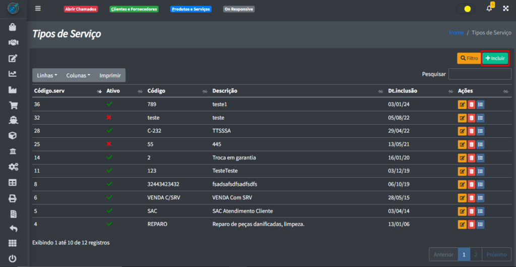 Para pode incluir um novo tipo de serviço, clique no botão “+ Incluir“: