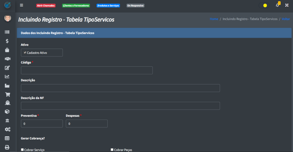Após clicar em “+ Incluir“, você verá uma tela onde poderá cadastrar o seu tipo de serviço: