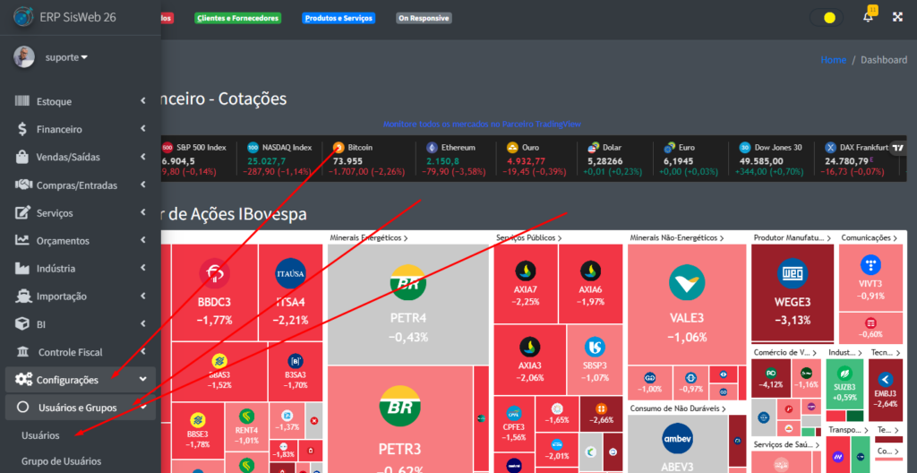 Para acessar a parte de Usuário, na aba lateral do sistema, clique em “Configurações” -> “Usuários e Grupos” -> “Usuários“.