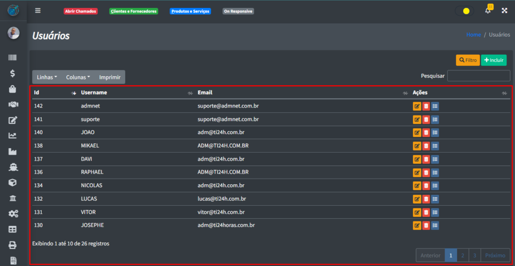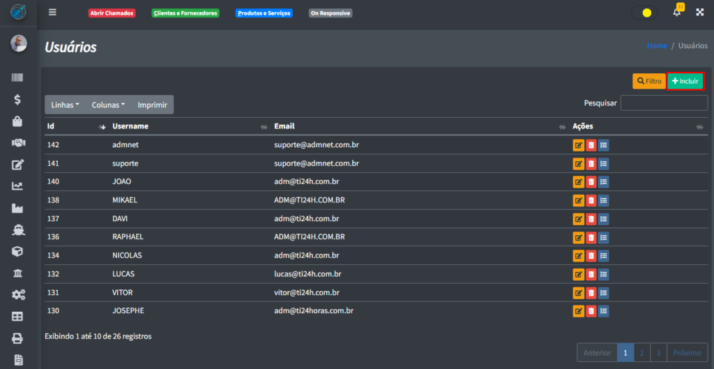 Para poder criar um novo usuário, clique no botão “+ Incluir“: