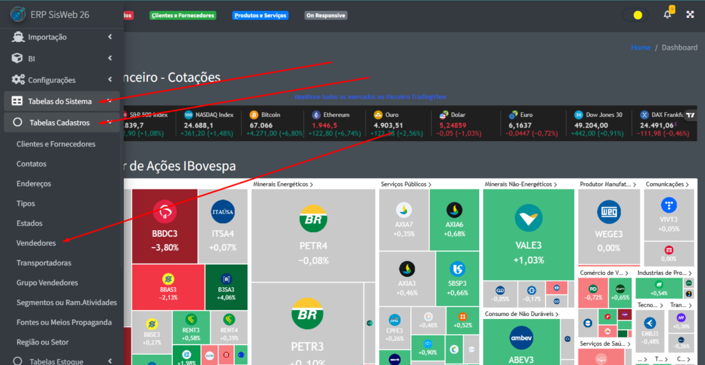 Para poder acessar a parte de cadastro de vendedores, na aba lateral do site, clique em “Tabelas de Sistema” -> “Tabelas Cadastros” -> “Vendedores“.