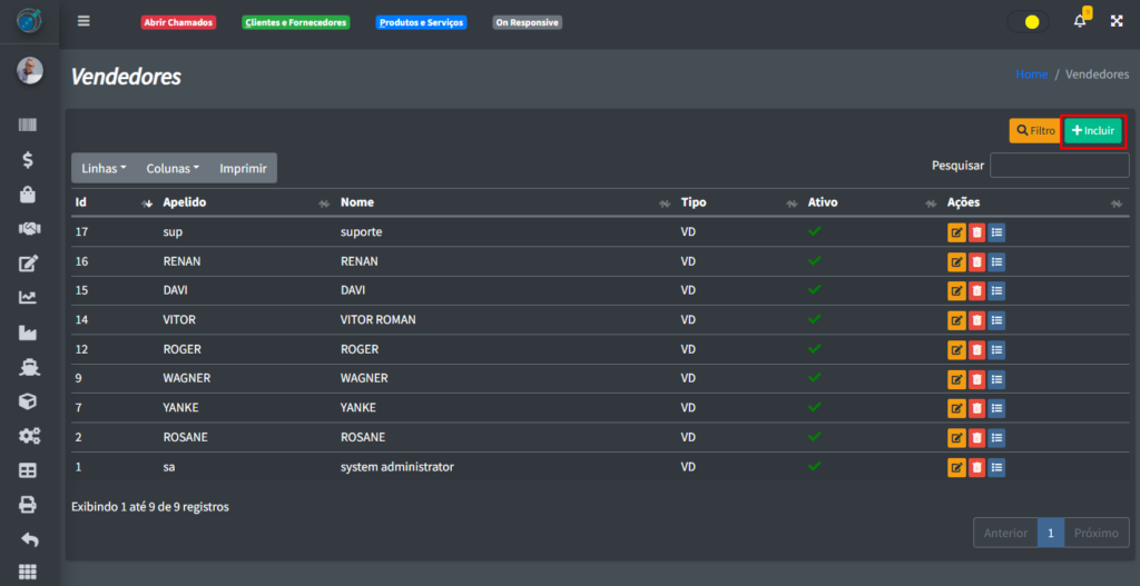 Para pode incluir um novo vendedor, clique no botão “+ Incluir“: