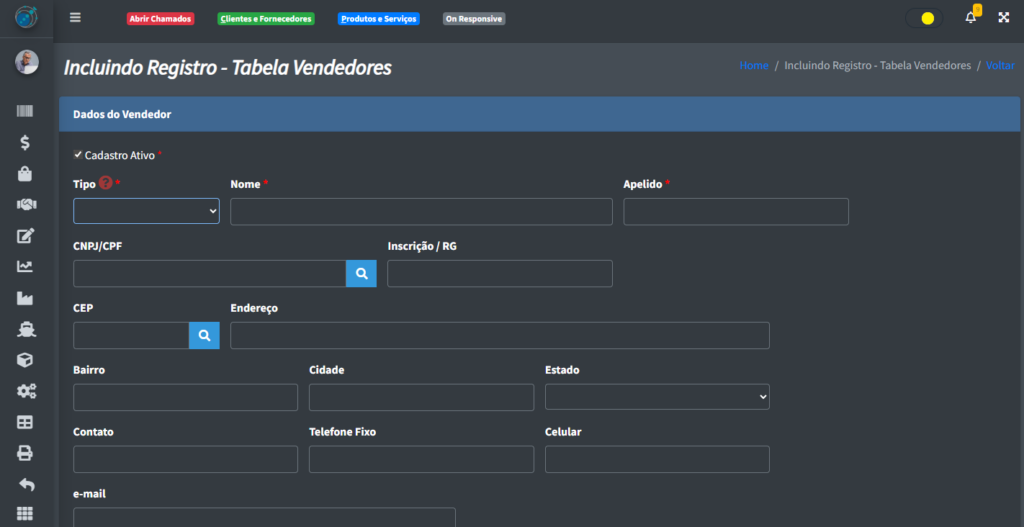 Após clicar em “+ Incluir“, você verá uma tela onde poderá cadastrar os seus vendedores: