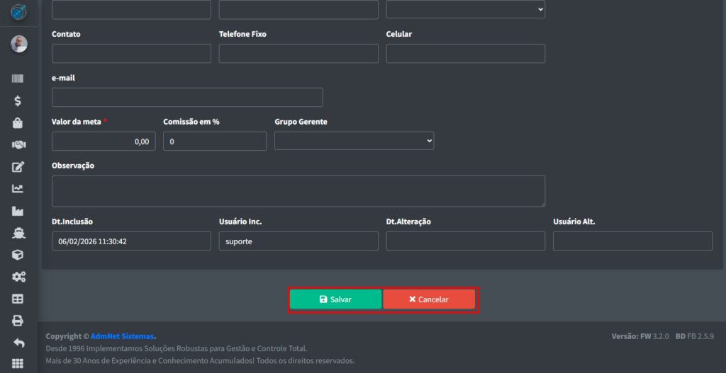 Após colocar as informações em todos os campos obrigatórios, poderá clicar nos botões “Salvar” ou “Cancelar“: