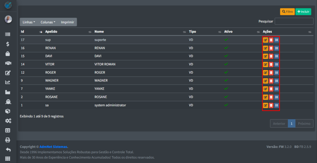 Como você deve ter percebido, há alguns botões na parte direita de cada registro da tabela: